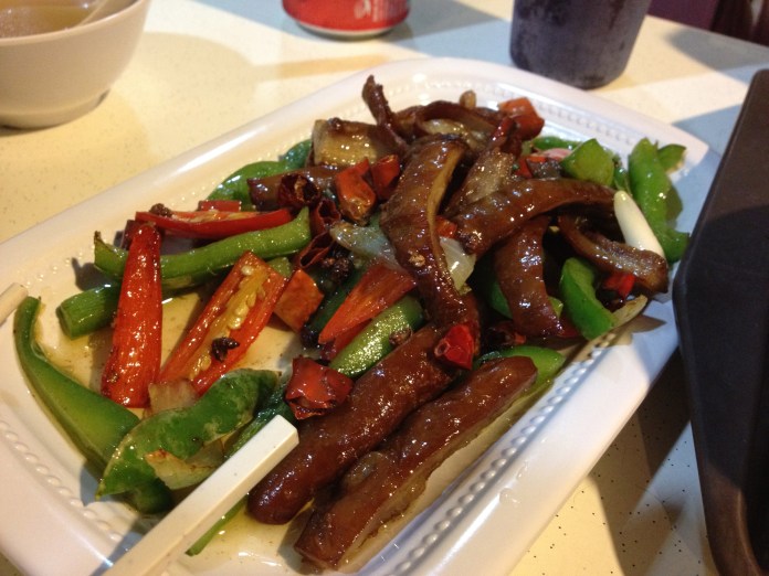 Char had stir-fried noodles topped with roast duck, while Daryl and I each had Hainanese rice topped with suckling pig and honeyed pork. I also had an extra order of “slightly fatty” (that’s what it said on the menu) intestines stir-fried with peppers. Healthy living at Singapore-la(h)nd!